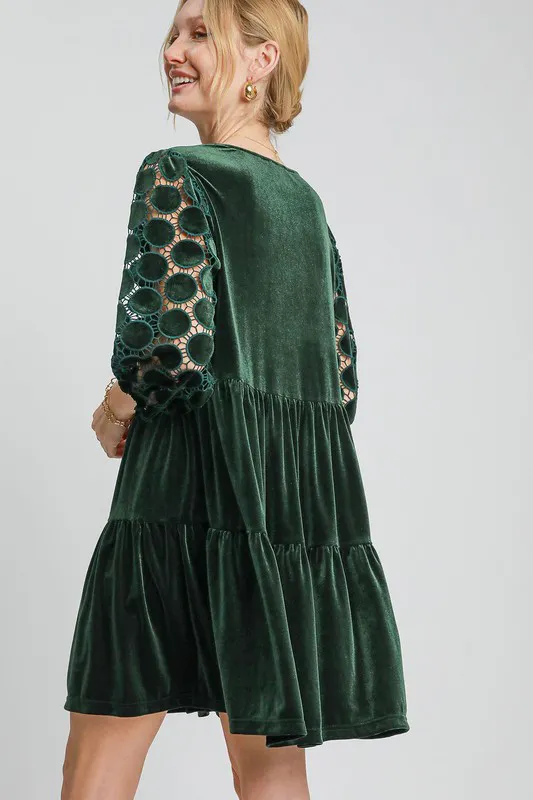 Dotted Lace Sleeve Tiered Velvet Mini Dress – Dark Green