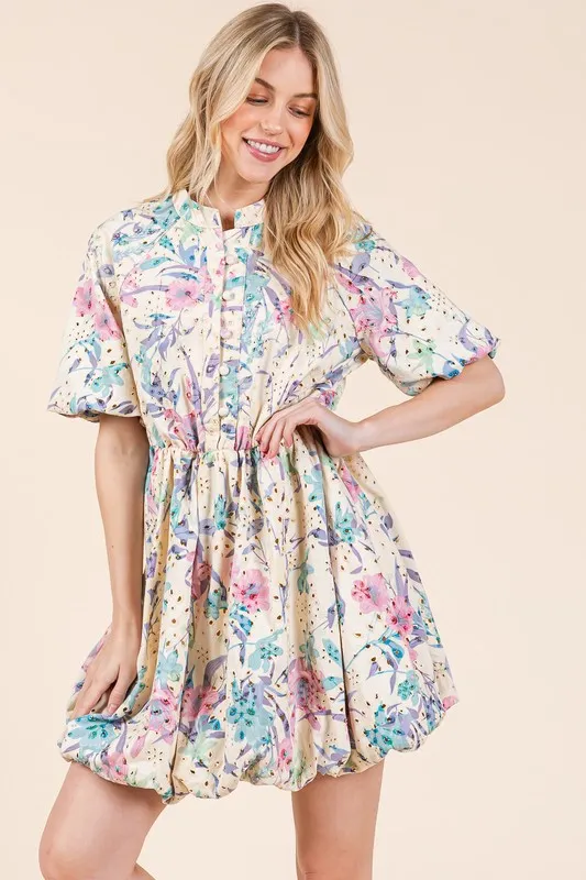 Floral Eyelet Lace Puff Sleeve Mini Shirt Dress – Purple/Pink