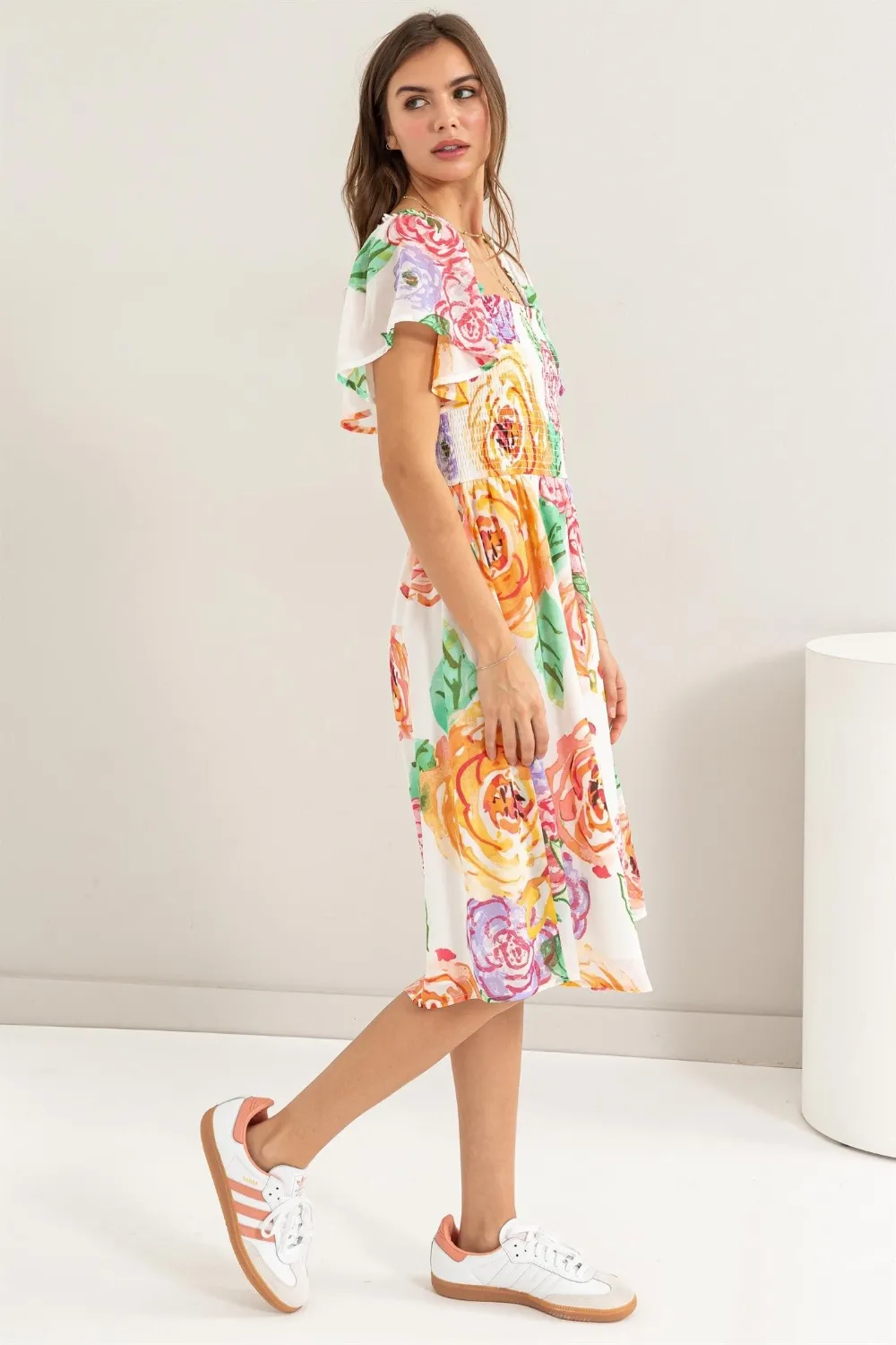 The Floral Flutter Sleeve Smocked Dress is a romantic and feminine choice for any occasion. Featuring delicate floral patterns and flutter sleeves, this dress exudes soft and graceful charm. The smocked waistline creates a flattering silhouette while providing comfort and flexibility. Perfect for a casual day out or a special event, this dress offers versatility and style. Pair it with heels for a dressier look or sandals for a more relaxed vibe. Embrace your romantic side with this lovely floral dress that is sure to turn heads wherever you go.