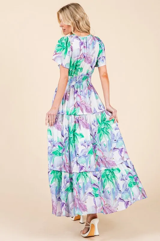 Floral Print Short Sleeve Smocked Maxi Dress – Lavender Combo
