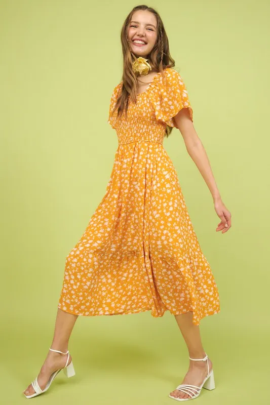Flower Print Flutter Sleeve Smocked Midi Dress – Gold