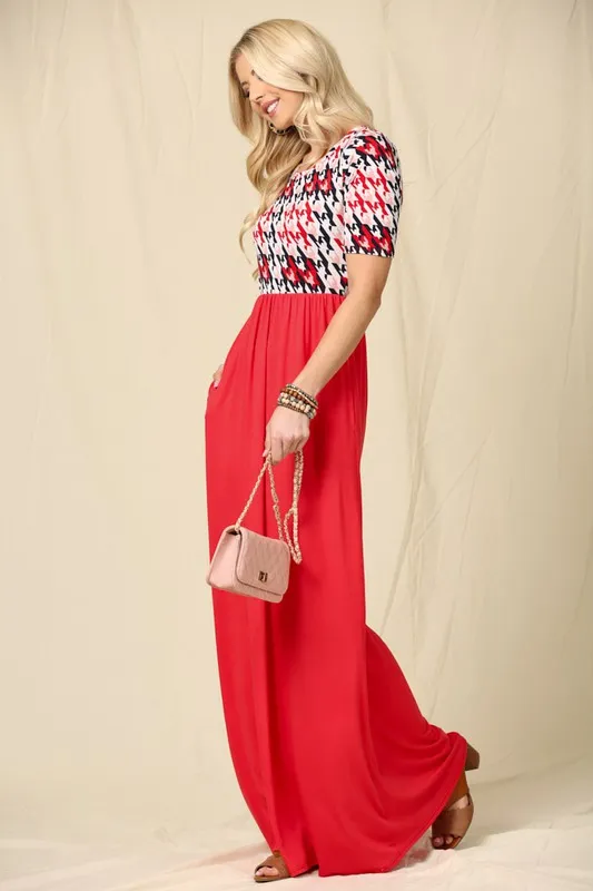 Full Size Houndstooth Round Neck Short Sleeve Maxi Dress Plus Size – Red