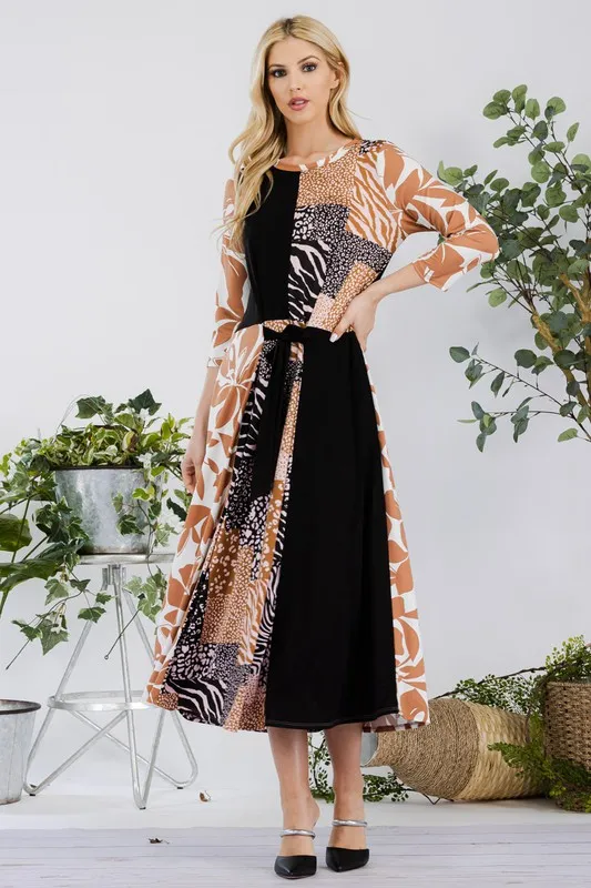 A new mixed pattern midi-dress is here to embrace you with a flowy silhouette, 3/4 sleeves, adjustable tie detail to give you some shape, and hidden side pockets! This midi-dress is perfect for the summer fall transition! Pair it with your favorite accessories, and jacket to make an effortless chic outfit!