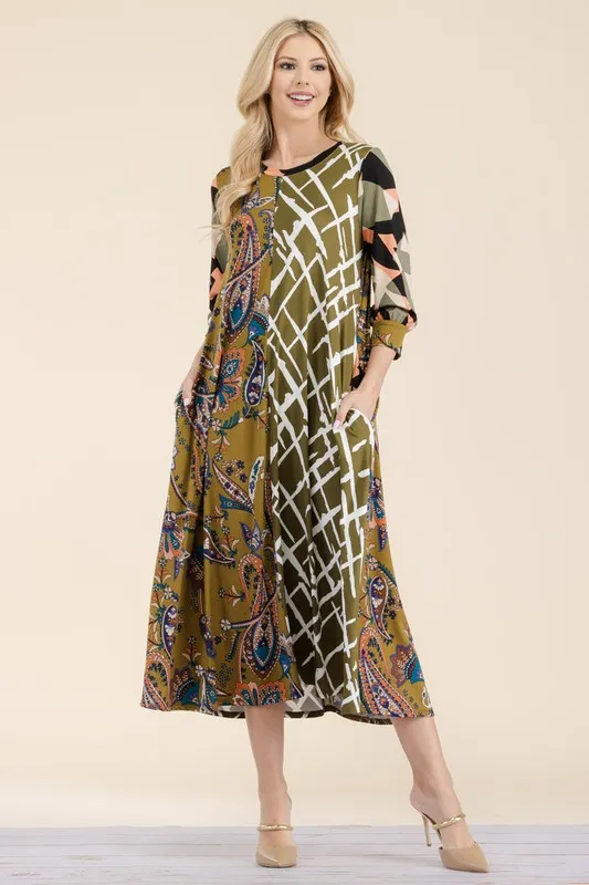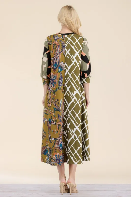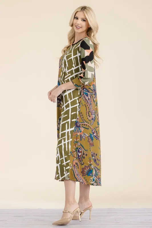 Full Size Paisley Contrast Tent Midi Dress Plus Size – Olive