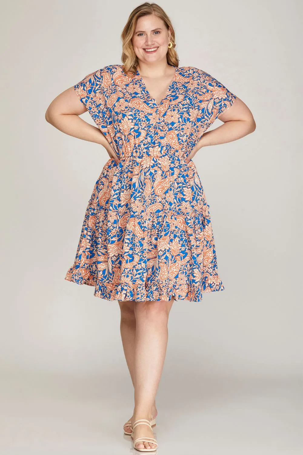 Full Size Ruffled Hem Printed Surplice Kimono Sleeve Mini Dress Plus Size – Royal Blue