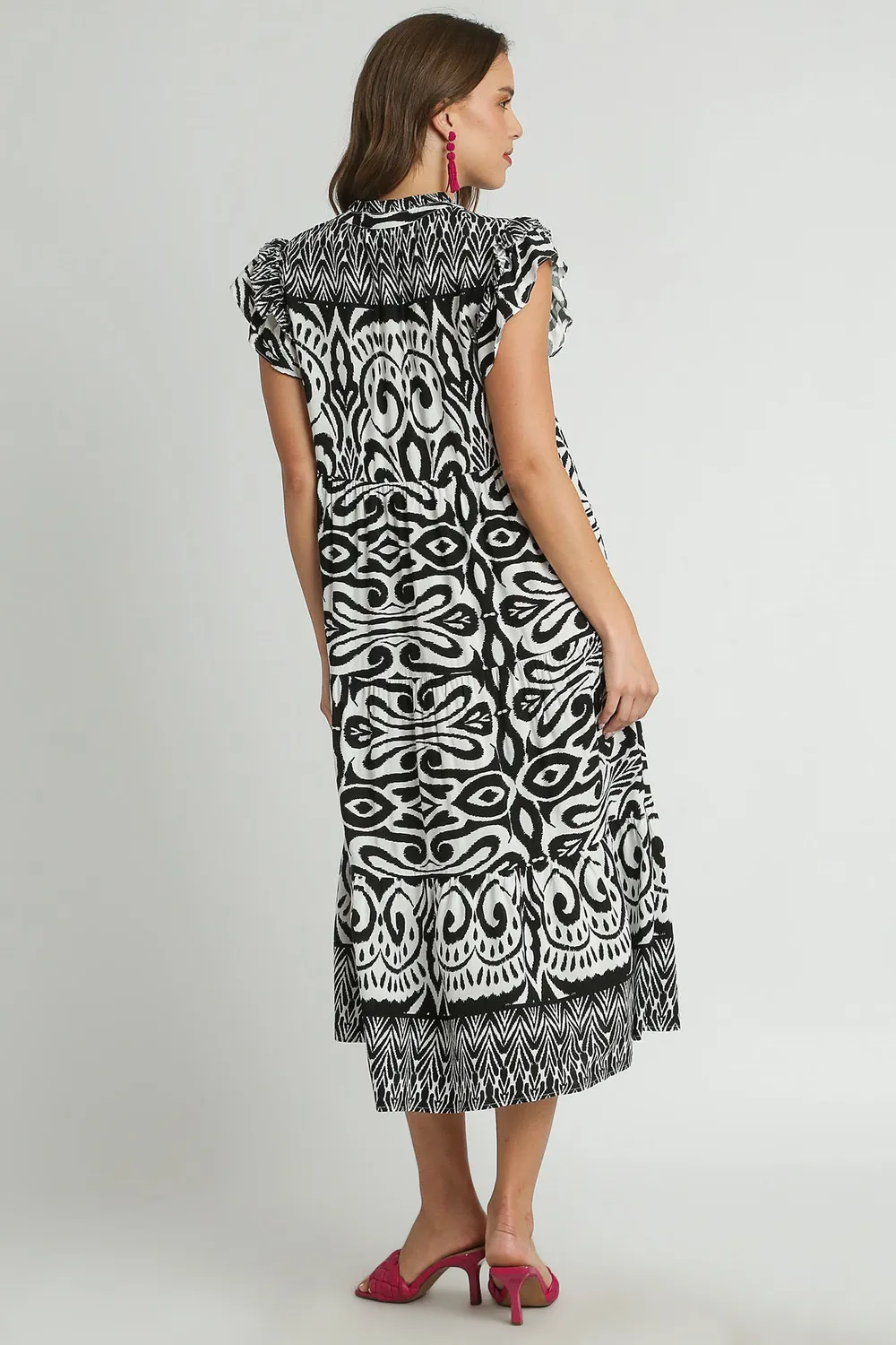 Full Size Two Tone Border Print Ruffle Cap Sleeve Midi Dress Plus Size – Black