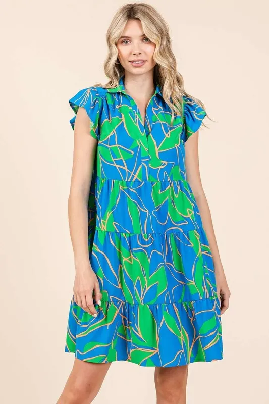 Leaf Print Ruffle Sleeve Tiered Mini Dress – Blue