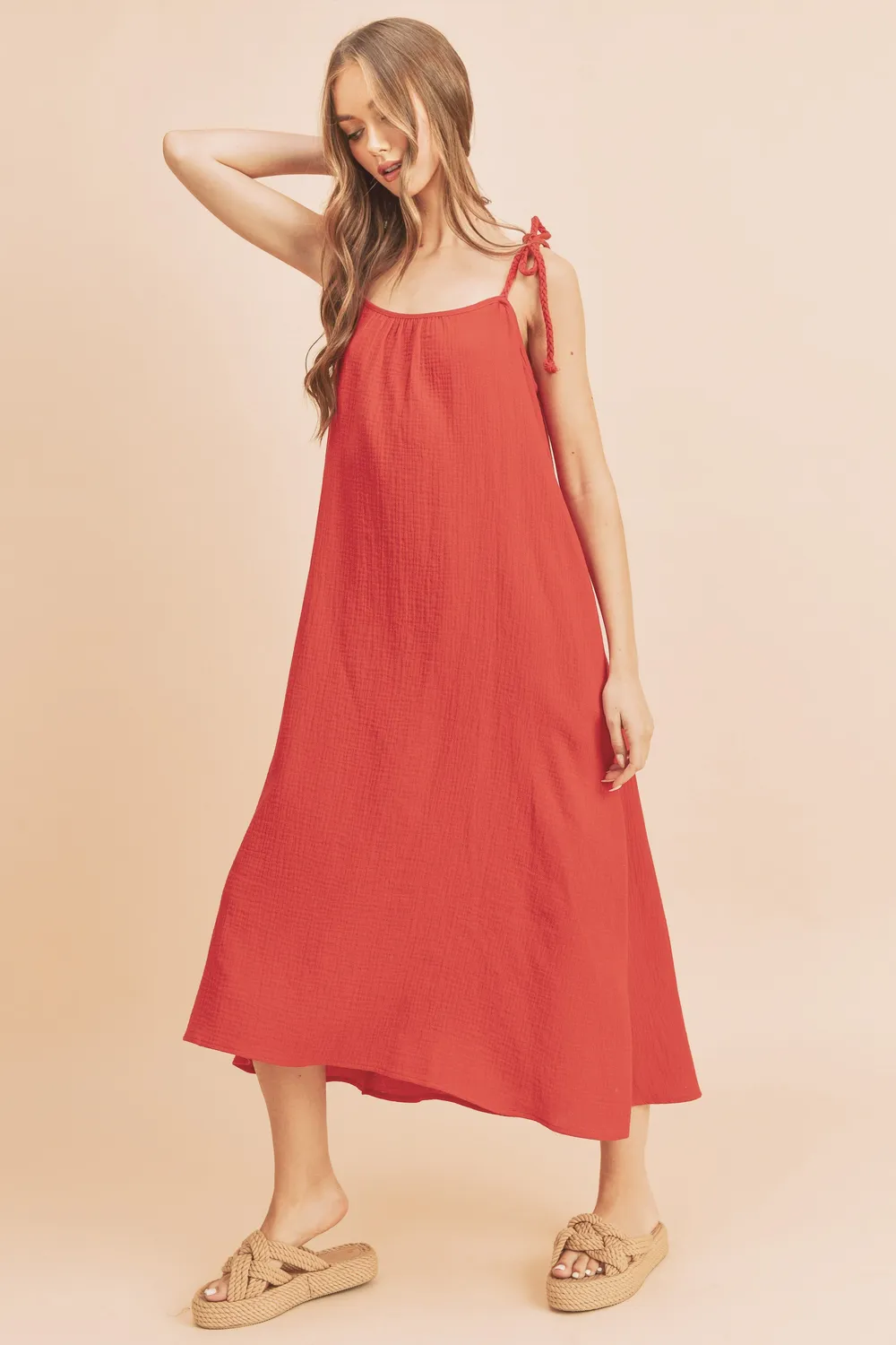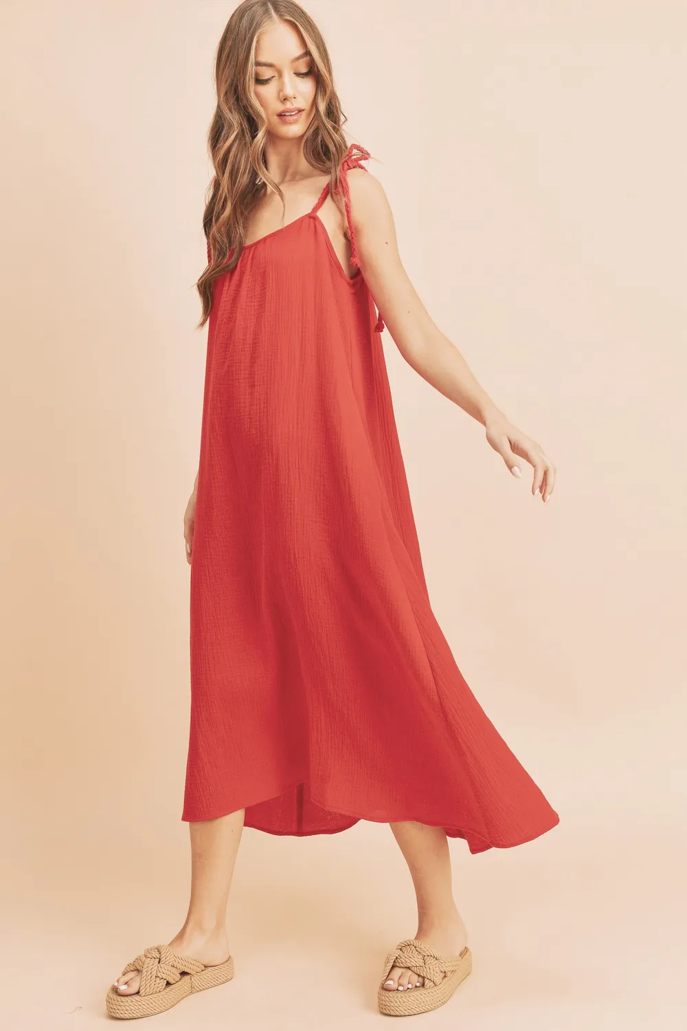 Sultry and stunning for any occasion, this sweet Pyper midi features a braided tie at the shoulder, pockets and made with the softest cotton gauze fabric.