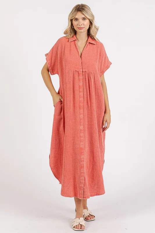 Mineral Wash V Neck Button Up Midi Shirt Dress – Burnt Coral