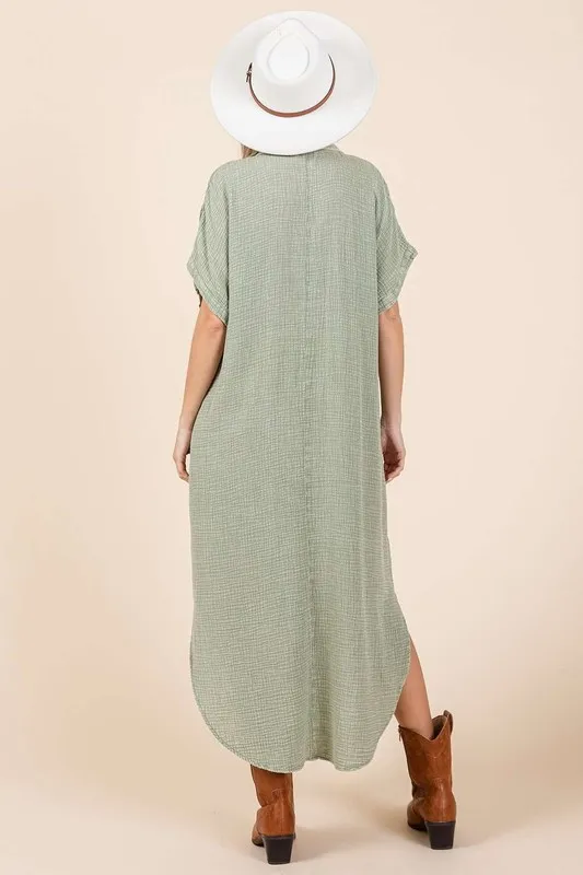 Mineral Wash V Neck Button Up Midi Shirt Dress – Sage