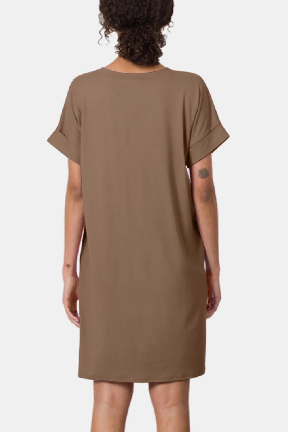 Rolled Short Sleeve V-Neck Dress – Mocha