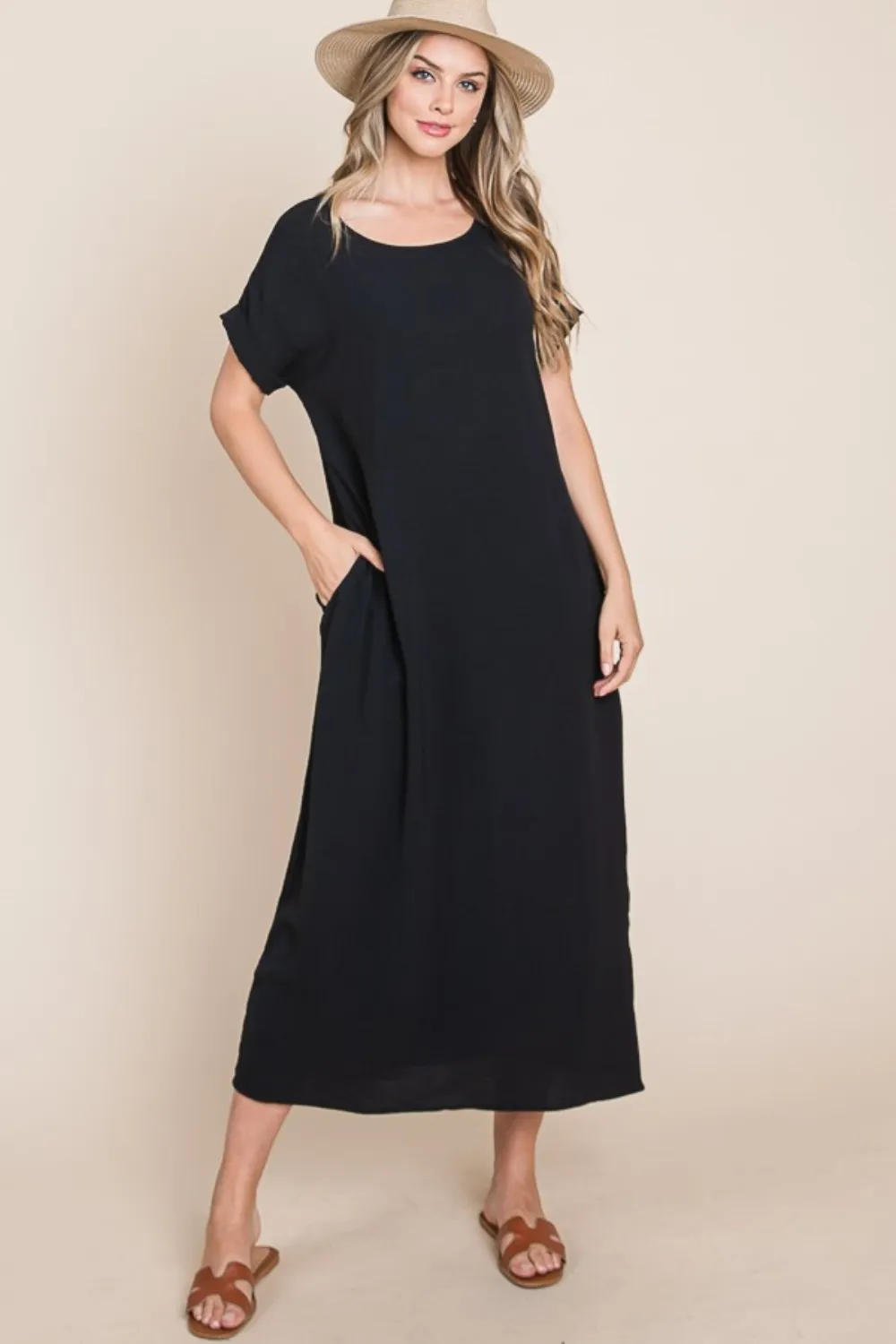 Round Neck Short Sleeve Midi Dress with Pockets – Black