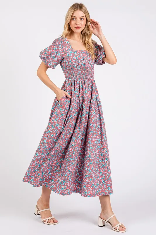 Smocked Floral Square Neck Puff Sleeve Midi Dress – Rose Pink