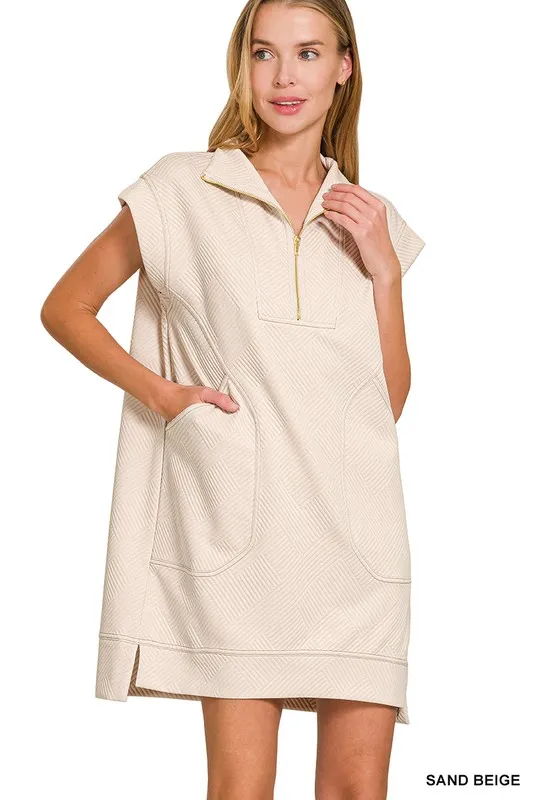 Textured Knit Jacquard Quarter Zipper Mini Dress – Sand Beige