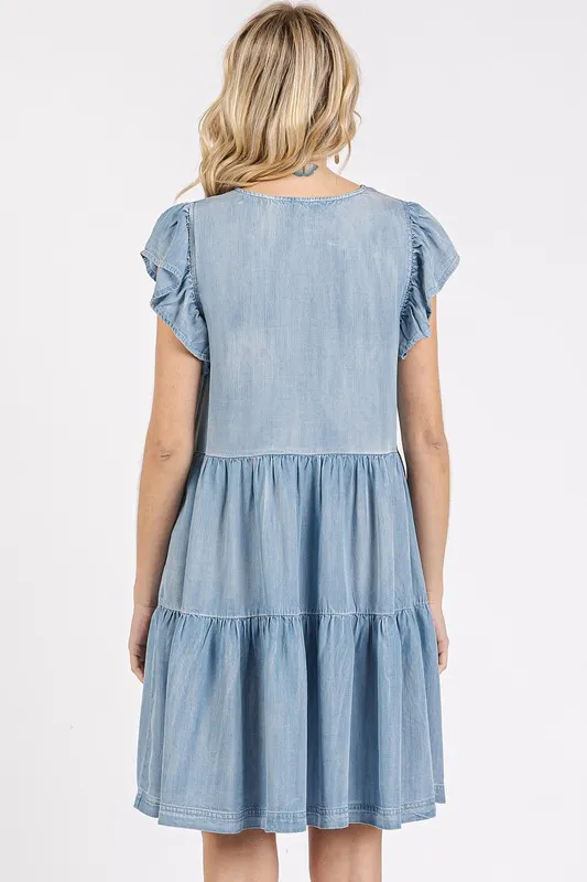 V-Neck Ruffled Cap Sleeve Mini Dress – Lt Denim
