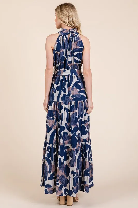 Abstract Halter Neck Tie-Waist Tiered Maxi Dress – Navy Combo