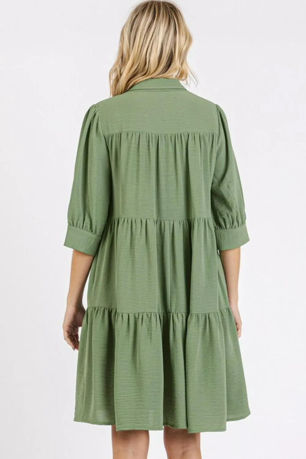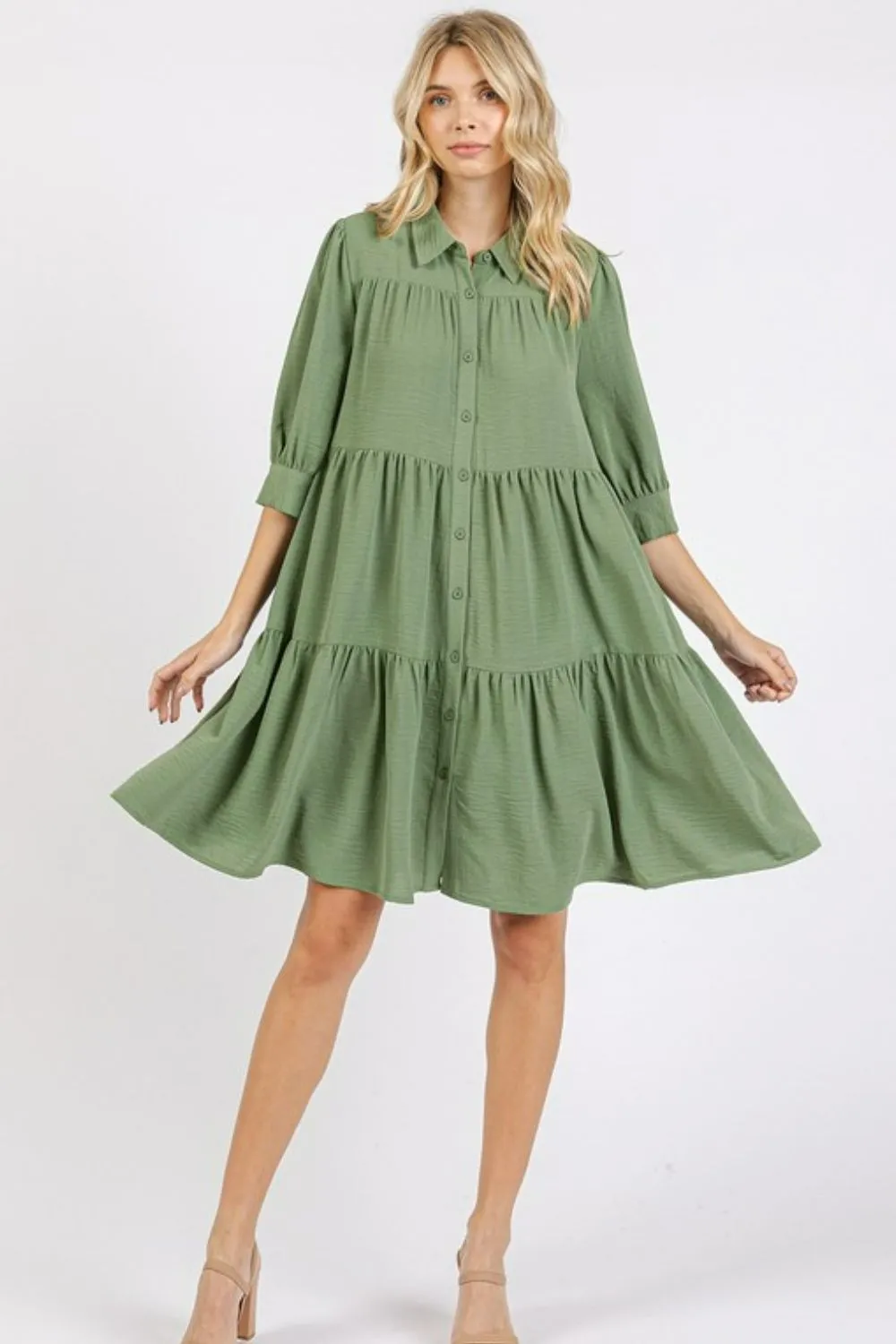Button Detail Collared Neck Tiered Shirt Dress – Sage