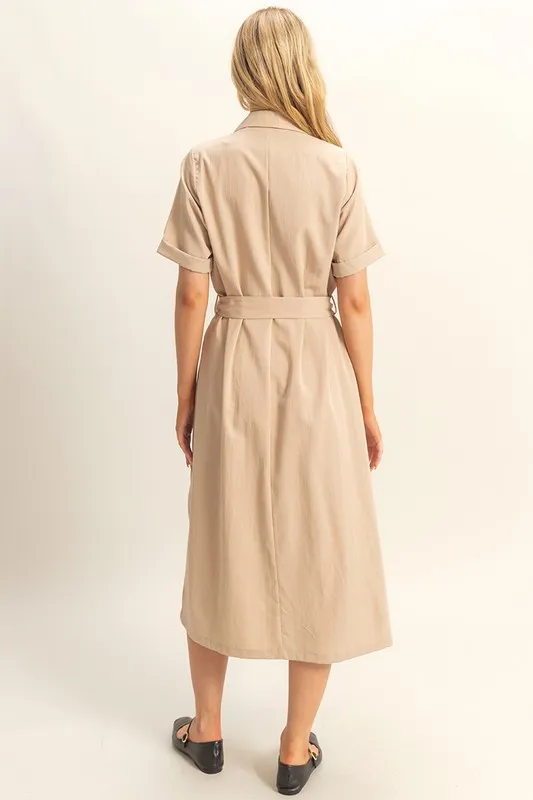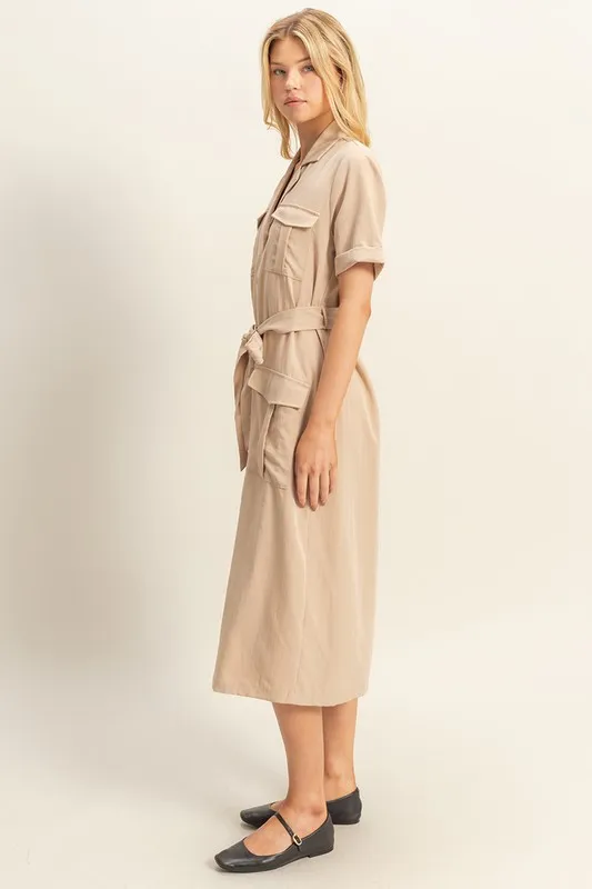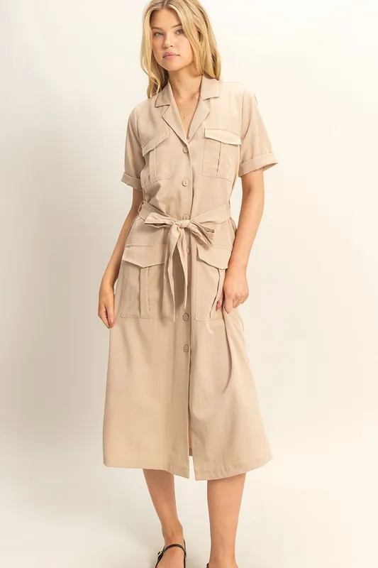 The Button Front Belted Safari Midi Dress is a chic and versatile piece featuring a button-down front and a belted waist. This dress offers a safari-inspired aesthetic with its utilitarian details and midi length. The belted waist cinches in the silhouette for a flattering fit, while the button-front design adds a touch of sophistication. Perfect for a casual yet polished look, this dress is a stylish and functional choice for a variety of occasions.