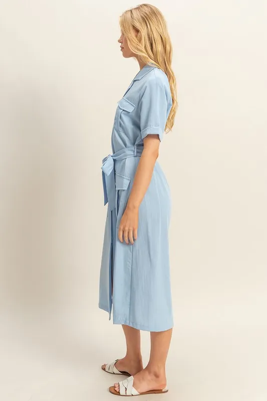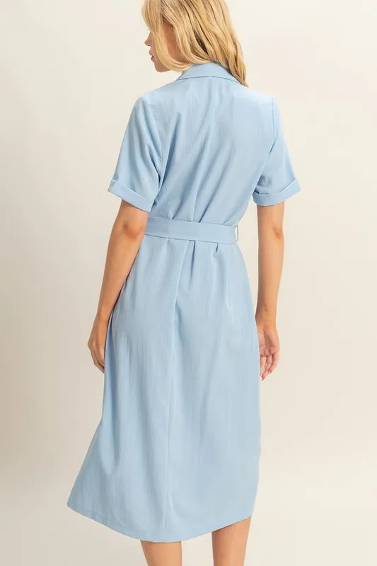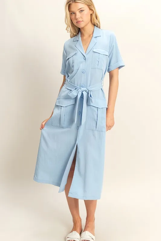 The Button Front Belted Safari Midi Dress is a chic and versatile piece featuring a button-down front and a belted waist. This dress offers a safari-inspired aesthetic with its utilitarian details and midi length. The belted waist cinches in the silhouette for a flattering fit, while the button-front design adds a touch of sophistication. Perfect for a casual yet polished look, this dress is a stylish and functional choice for a variety of occasions.