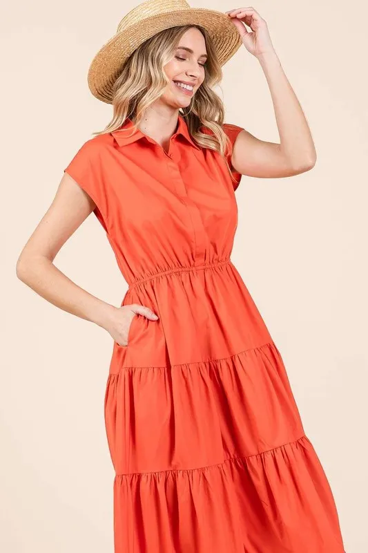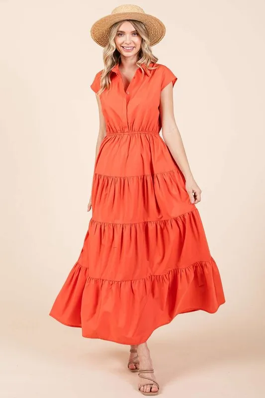 Button Up Collared Tiered Maxi Shirt Dress – Orange