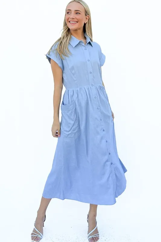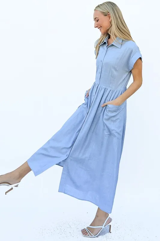 Cap Sleeve Front Pockets Shirt Dress – Blue