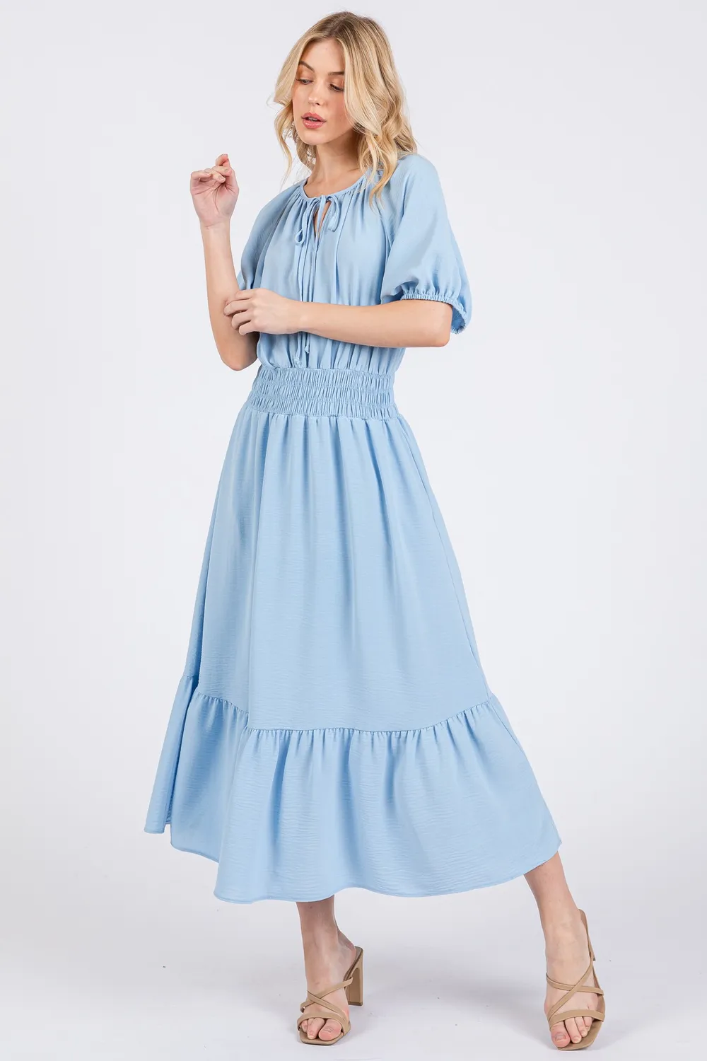 Ces Femme Smocked Elastic Waist Tie Neck Puff Sleeve Dress – Blue