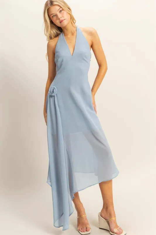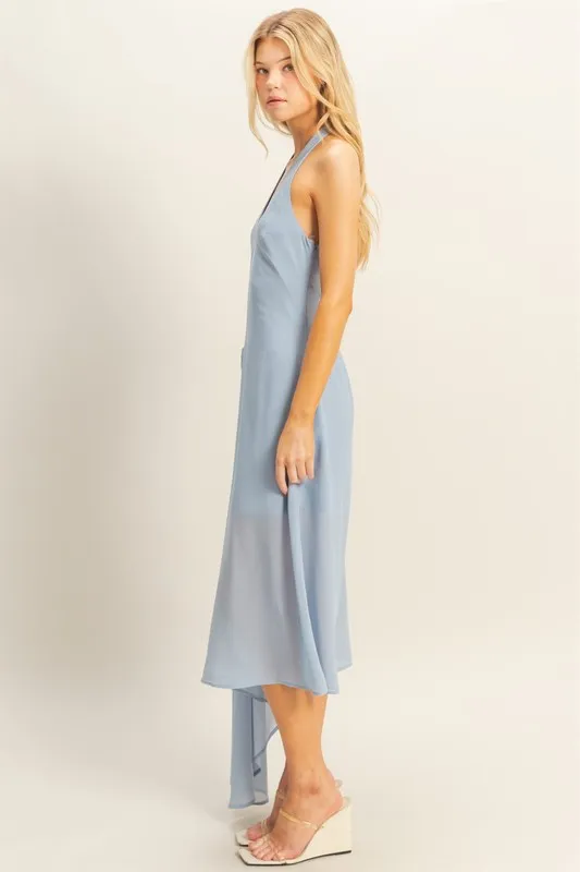 Chiffon Halter Asymmetrical Hem Dress – Dusty Blue