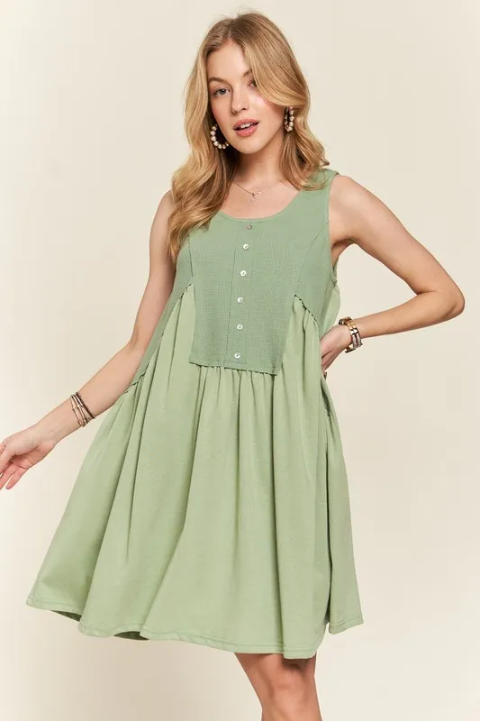 Decorative Button Sleeveless Babydoll Dress – Sage