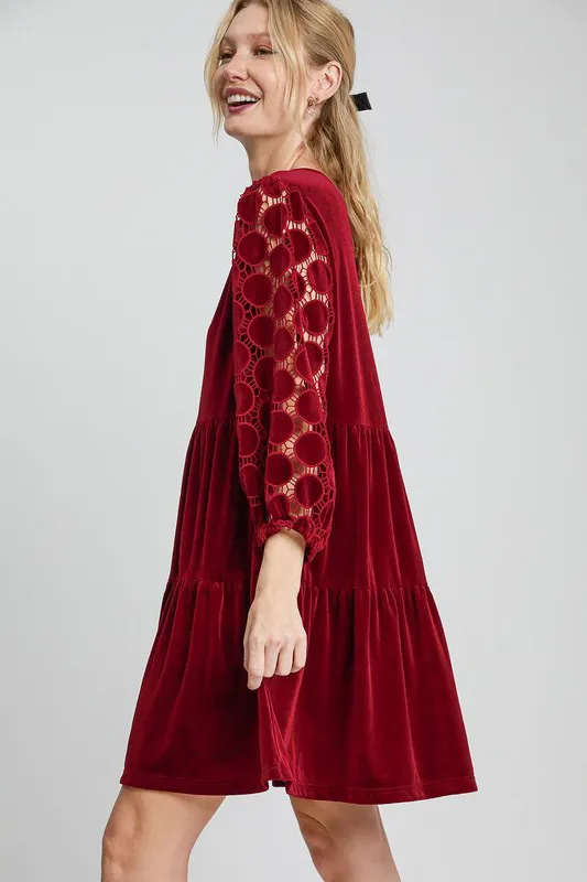 Dotted Lace Sleeve Tiered Velvet Mini Dress – Burgundy