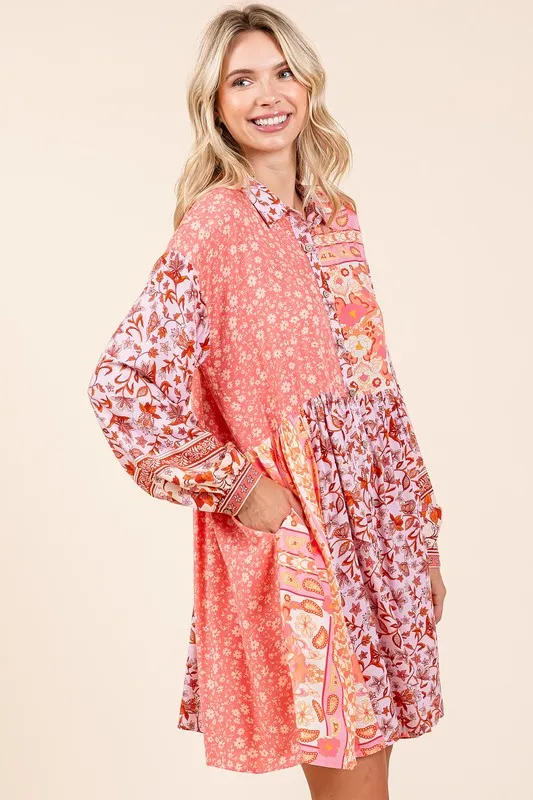 Floral Button Detail Long Sleeve Shirt Dress – Coral Pink