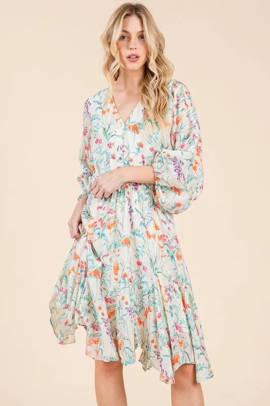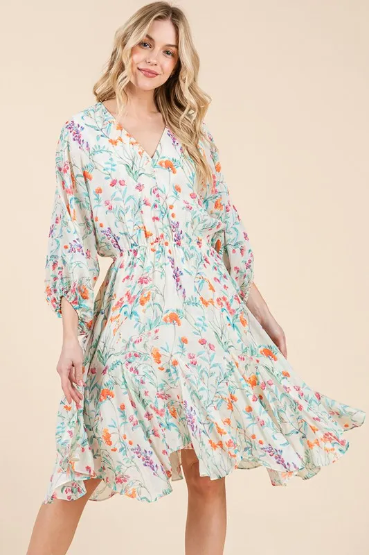 Floral Cinched Waist Balloon Sleeve V-Neck Dress – Ivory Floral