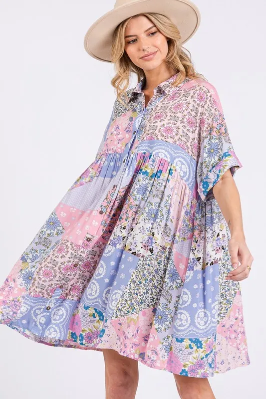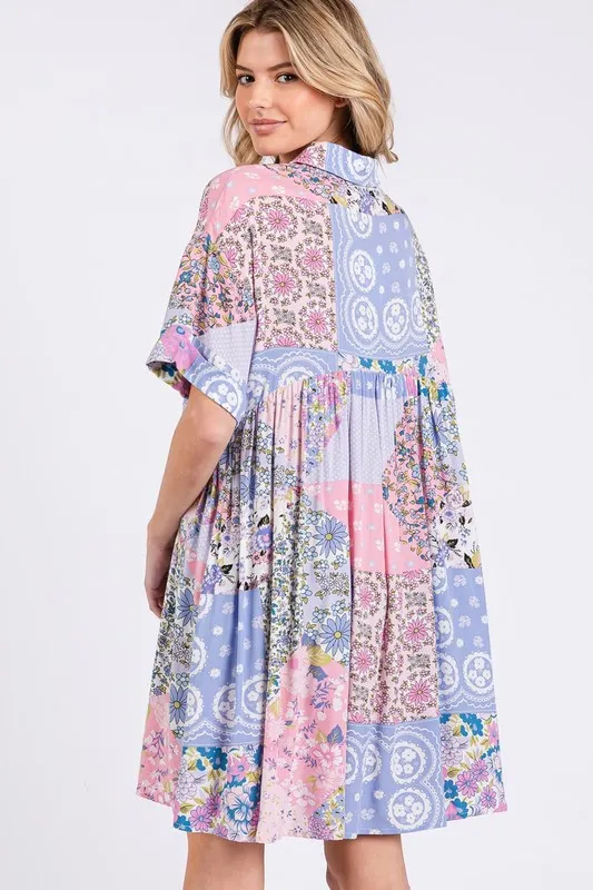 Floral Collared Neck Half Sleeve Mini Shirt Dress – Pink Multicolor