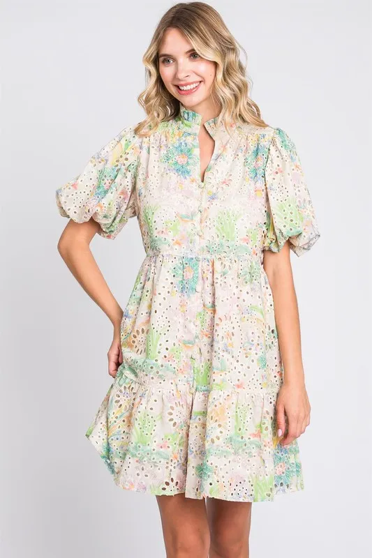 Floral Eyelet Lace Puff Sleeve Mini Dress – Green Multicolor