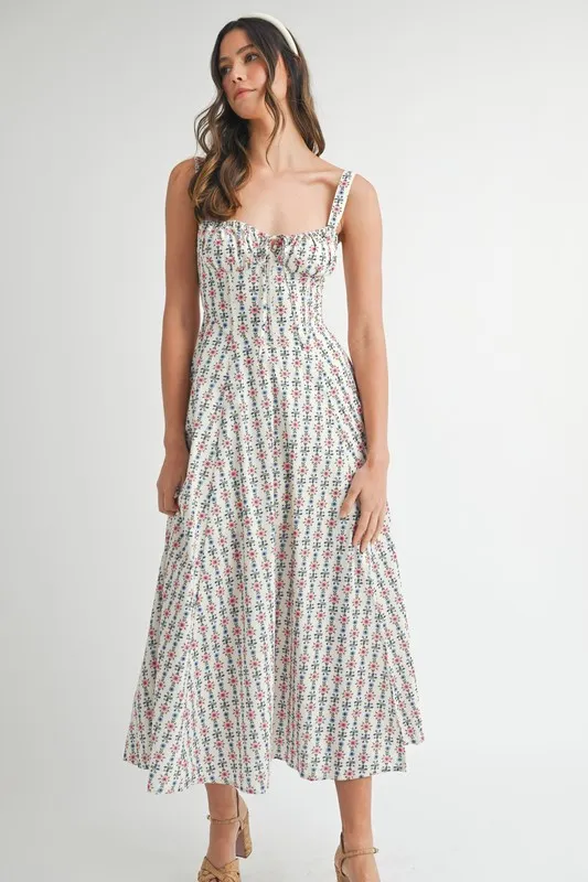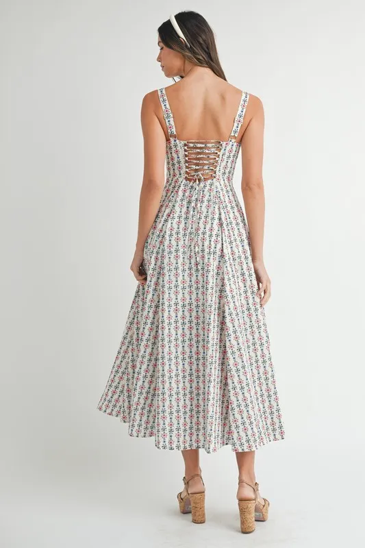 Floral Print Bustier Back Lace Up Midi Dress – Cream