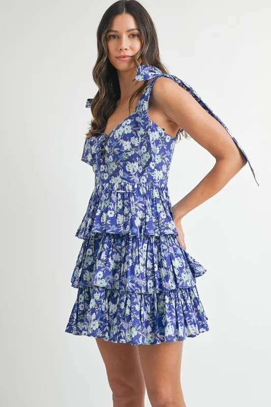 Floral Print Shoulder Tie Layered Mini Dress – Royal Blue