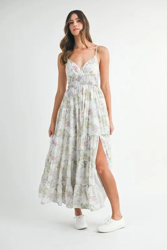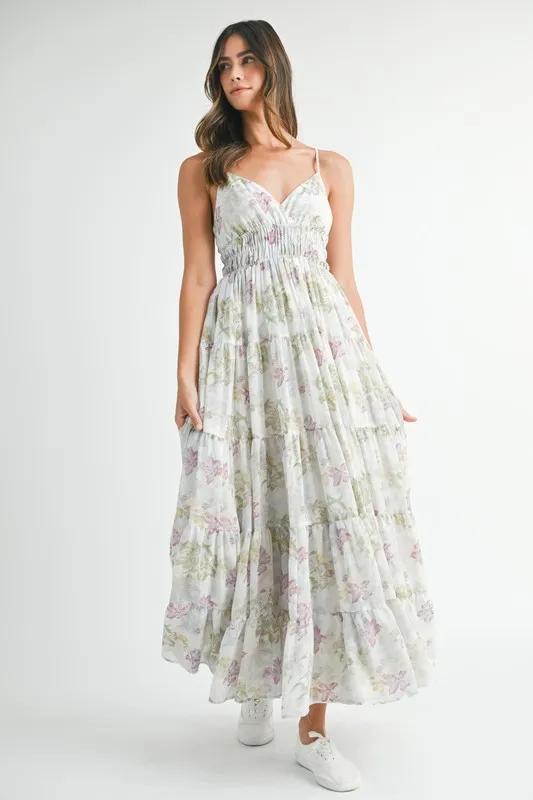 The floral print tiered cami maxi dress is a breezy and feminine piece adorned with a charming floral pattern. Its tiered design adds volume and movement to the dress, creating a flowy and ethereal look. With its cami straps and maxi length, this dress is perfect for warm-weather occasions, offering a stylish and comfortable option for a chic summer outfit.