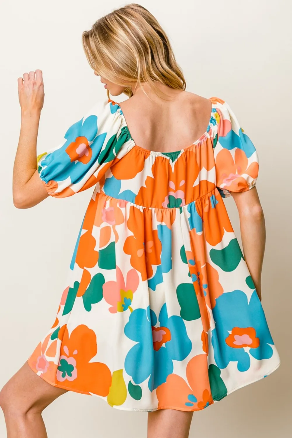 Floral Puff Sleeve Mini Dress – Cream/Orange/Blue