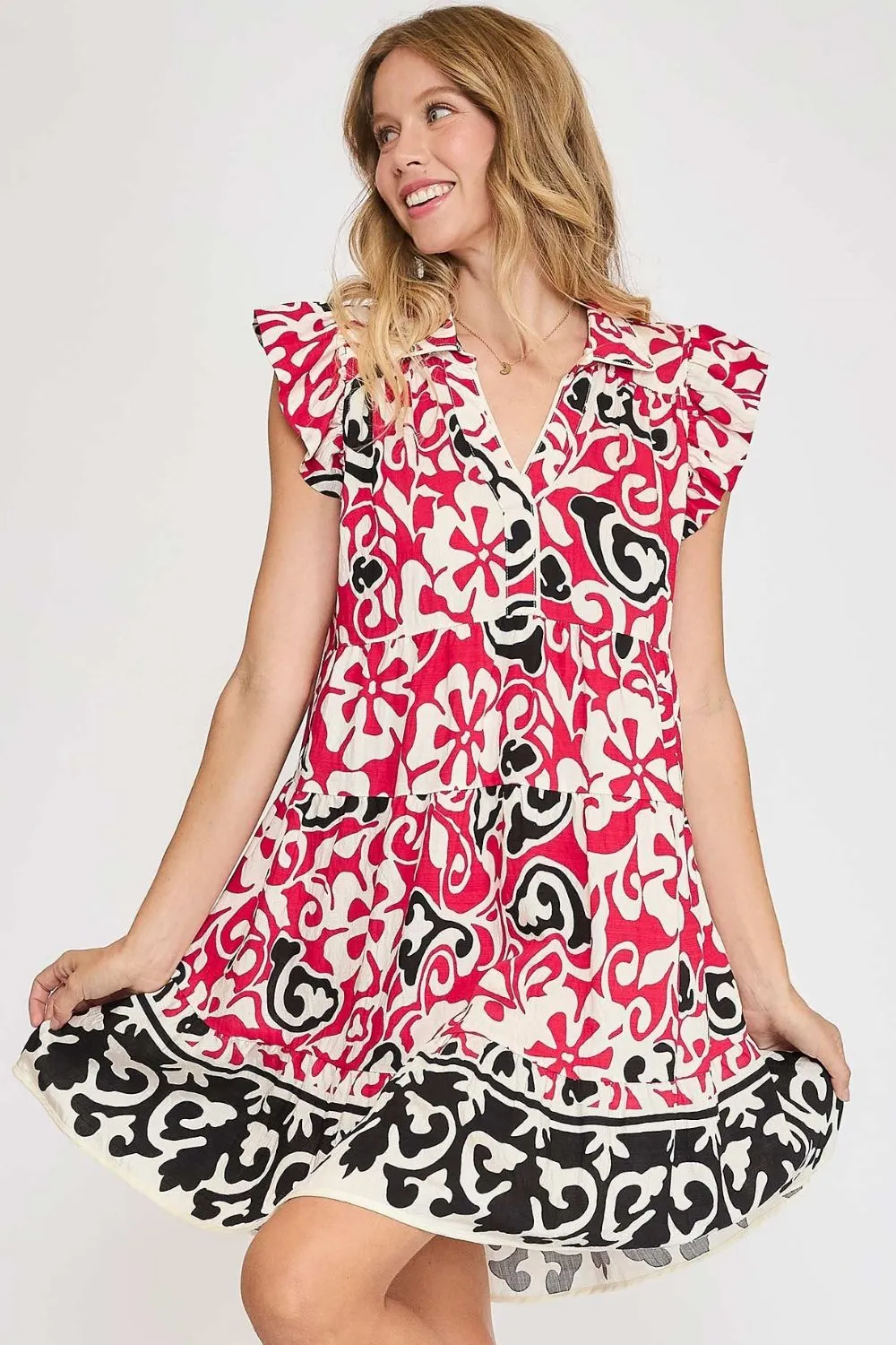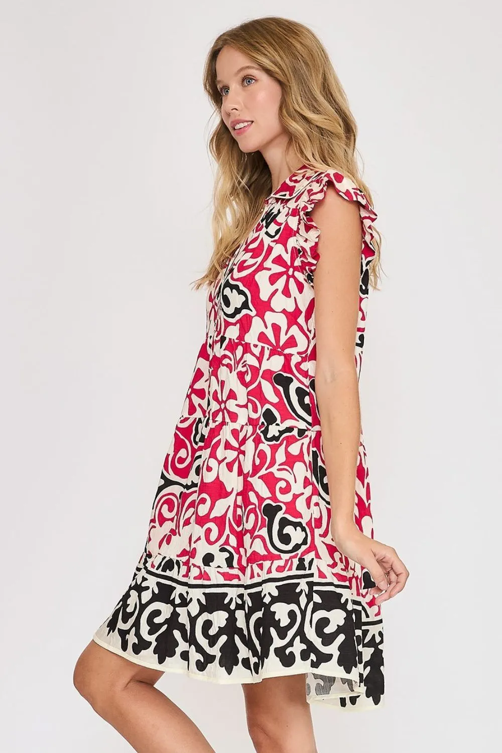 The Floral Ruffled Cap Sleeve Tiered Dress is a delightful and feminine dress that embodies romance and charm. This dress features a lovely floral print, delicate ruffled cap sleeves, and tiered detailing for a playful and flowy silhouette. Perfect for a garden party or a summer outing, this dress exudes a sweet and whimsical vibe, adding a touch of elegance to your ensemble.