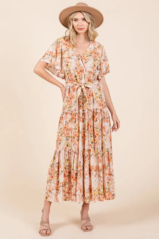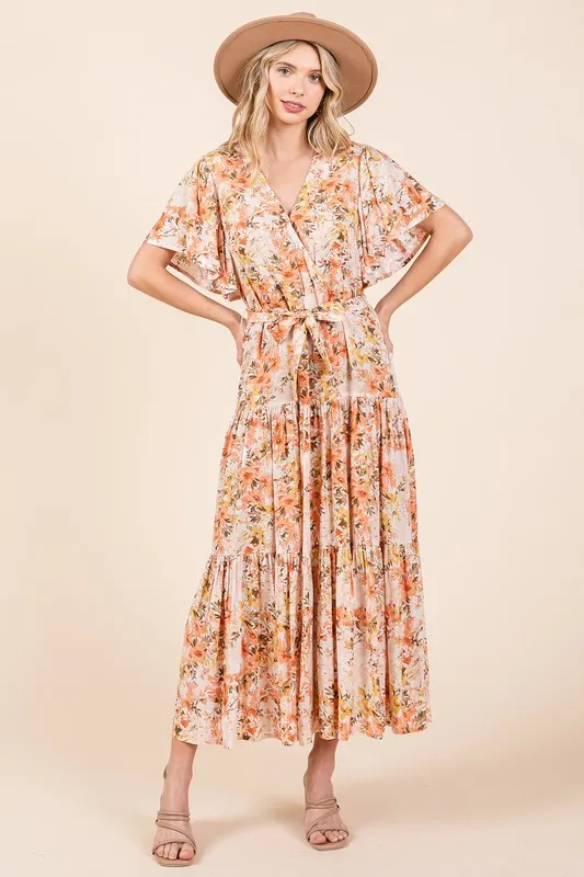 Floral Tie Waist Flutter Sleeve Tiered Dress – Tangerine