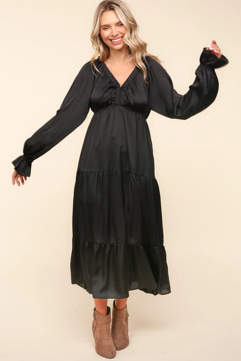 Flounce Sleeve Tiered Midi Dress with Pockets – Black