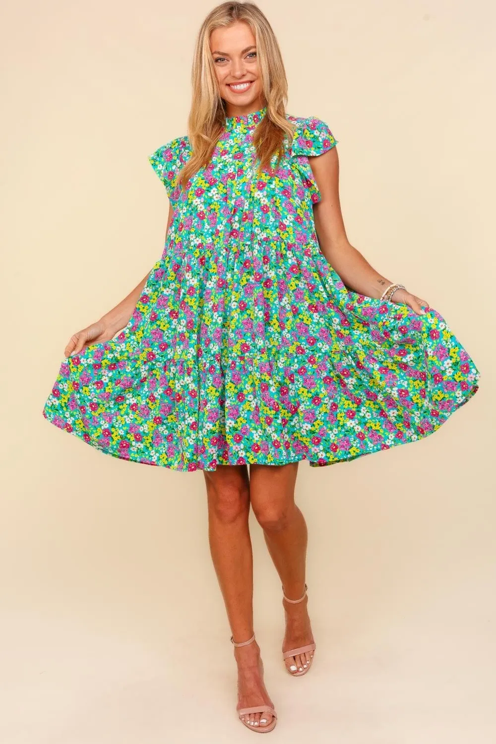 Frilled Mock Neck Ditsy Floral Dress – Aqua