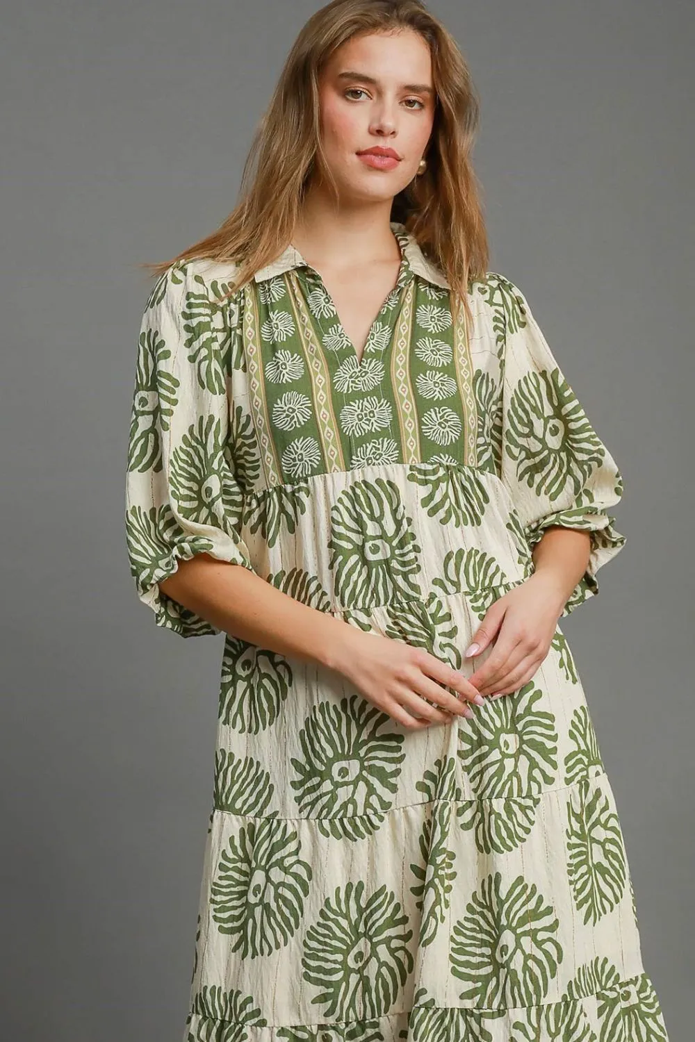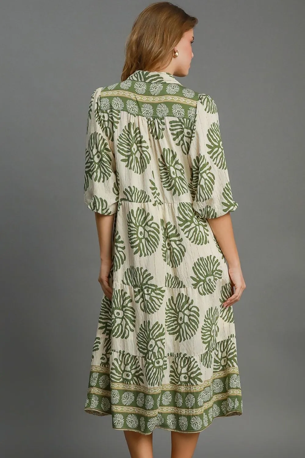 Full Size Border Print Tiered Midi Dress Plus Size – Matcha Green