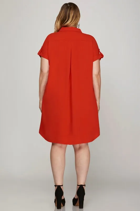Full Size Button Down Short Sleeve Woven Shirt Dress Plus Size – Deep Red