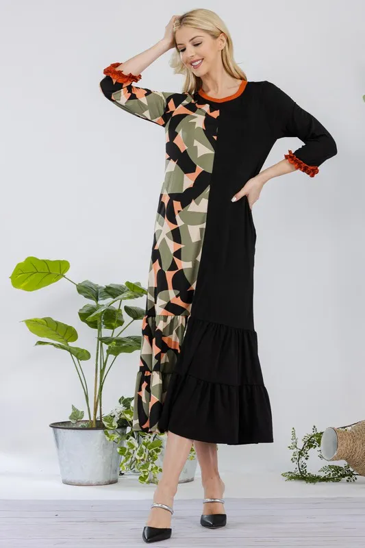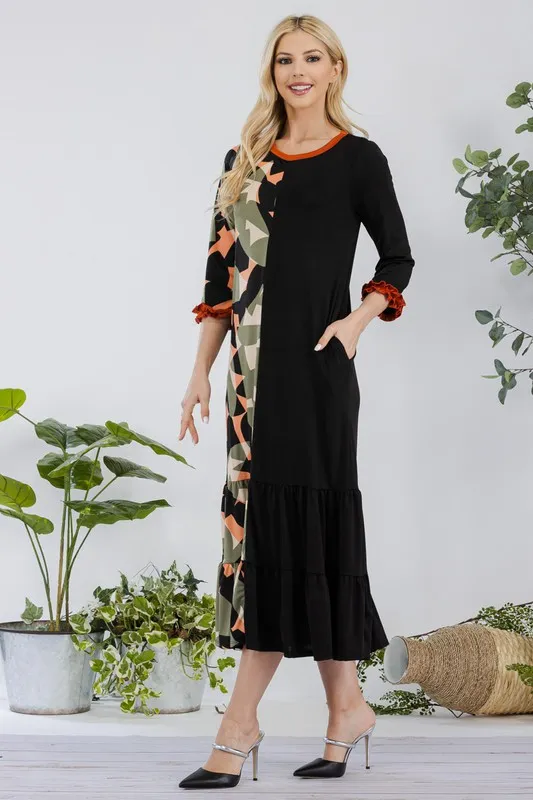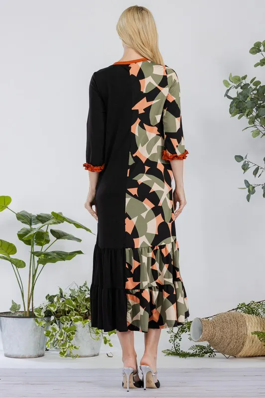 This modest midi-dress is decorated with a unique color print. This 3/4 ruffle sleeve piece is designed with a round neck, tiered ruffle skirt, and concealed side pockets. This dress is perfect for weekends, school, and summer fall transition.