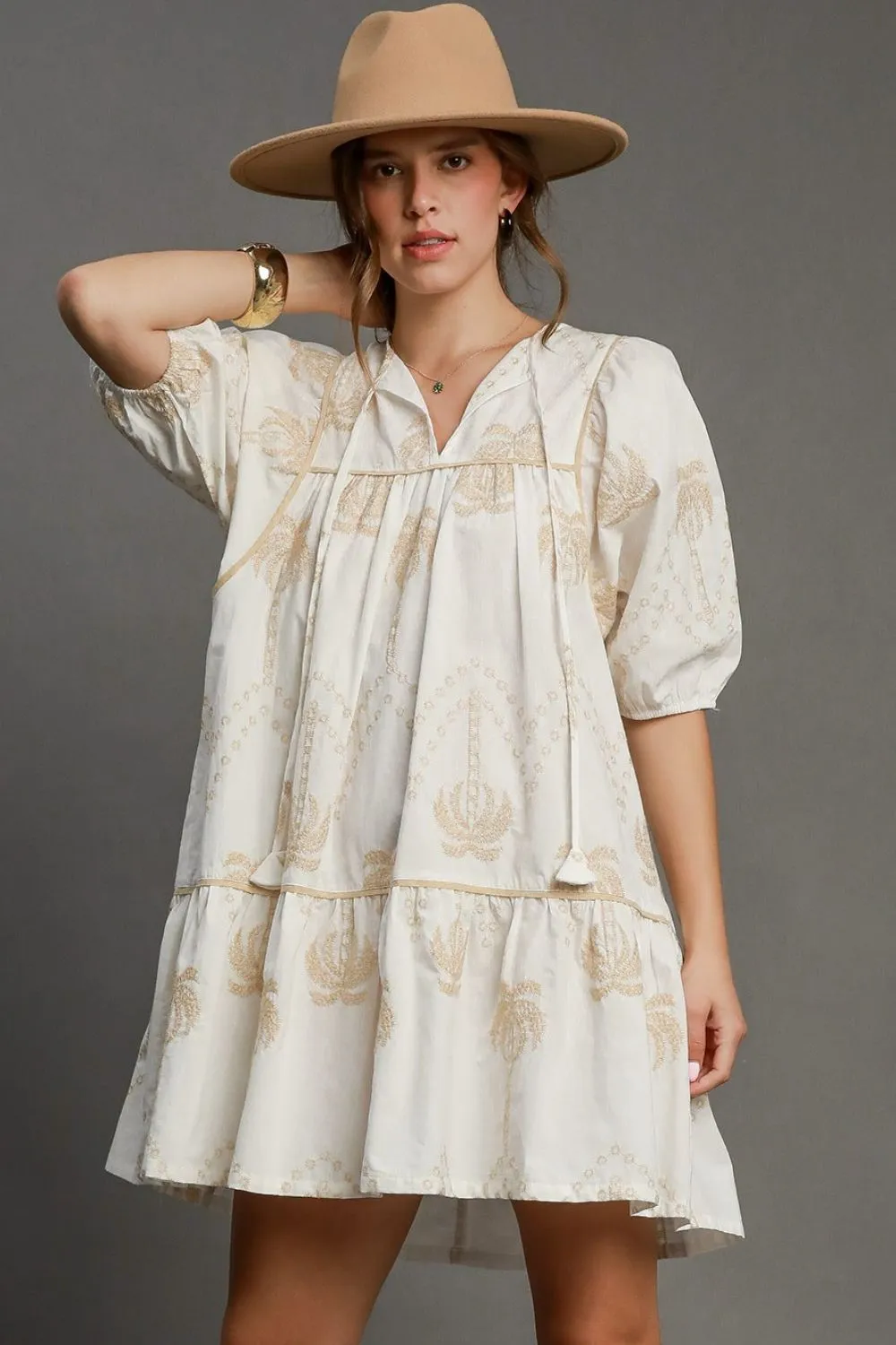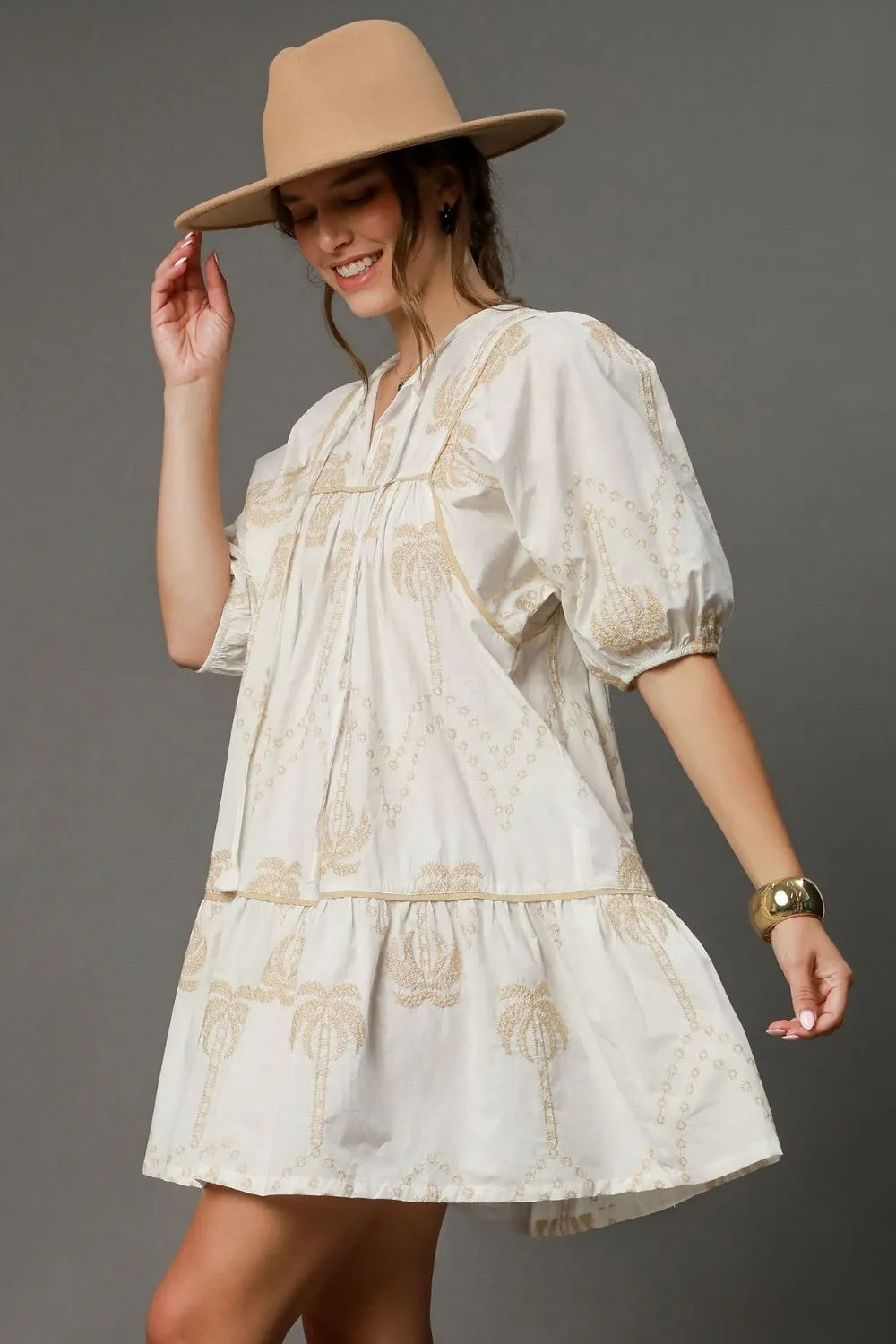 Full Size Embroidered Puff Sleeve Babydoll Dress Plus Size – Off White