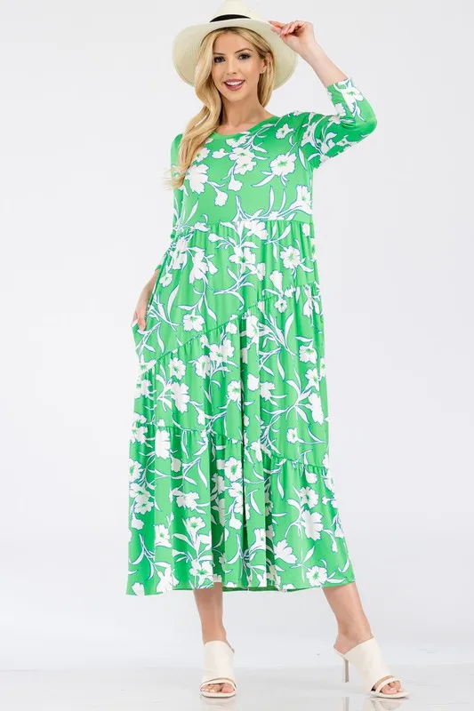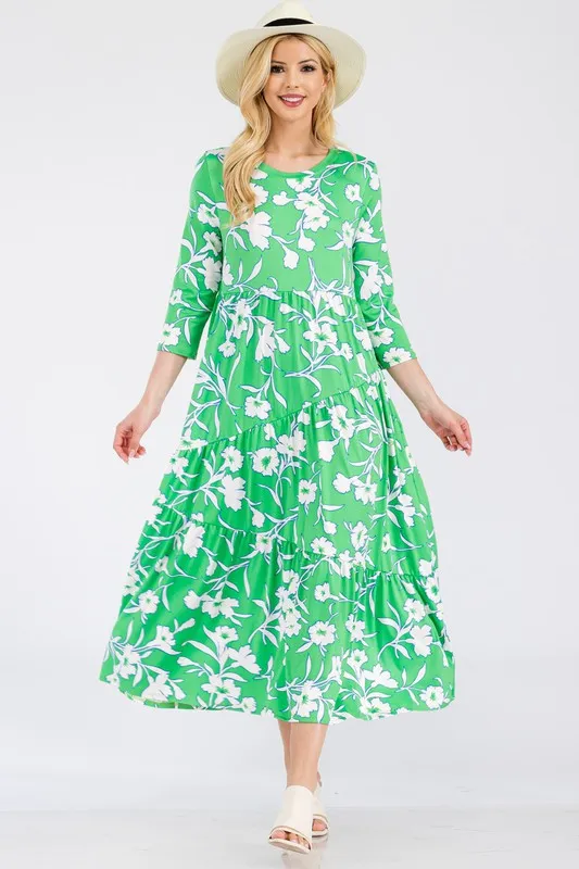 Full Size Floral Print Asymmetric Tiered Midi-Dress Plus Size – Green Floral