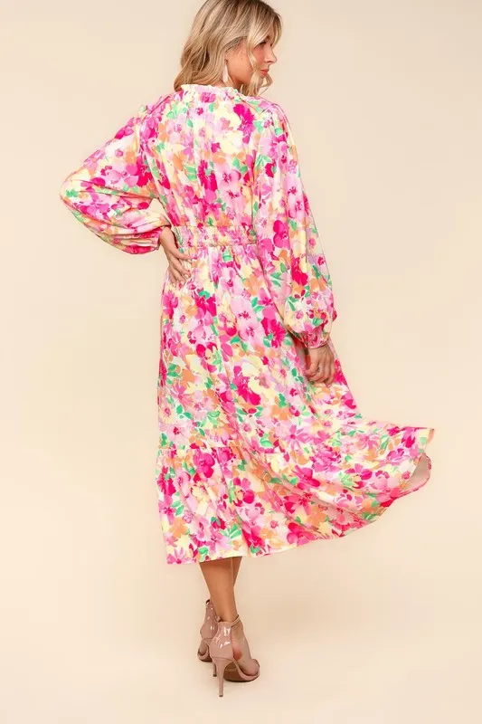 Full Size Floral Surplice Balloon Sleeve Dress with Side Pockets – Multicolor