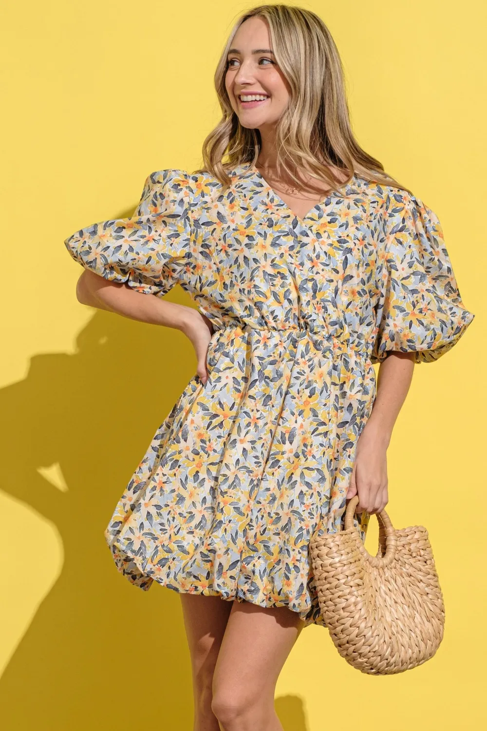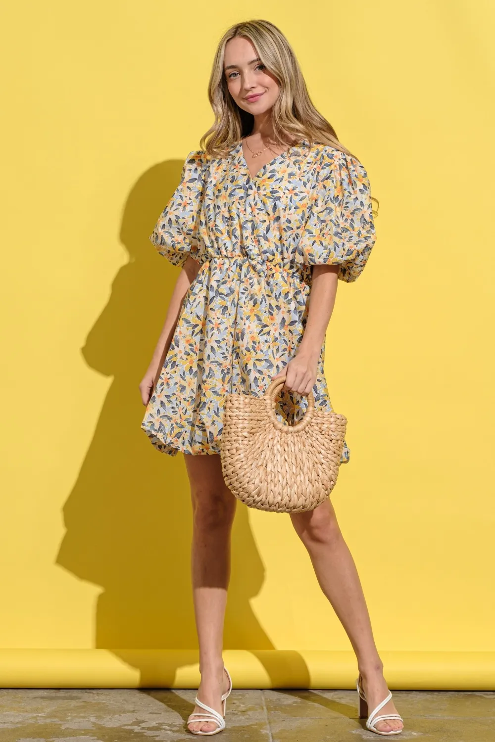 Full Size Floral Surplice Puff Sleeve Dress – Yellow Multi
