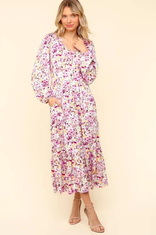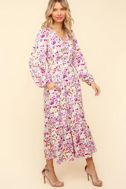 Full Size Floral V-Neck Long Sleeve Dress with Side Pockets – Lilac