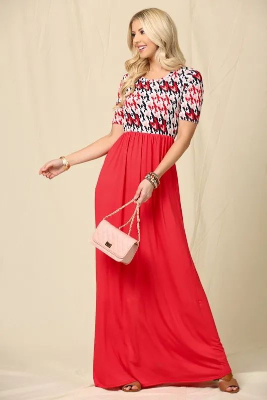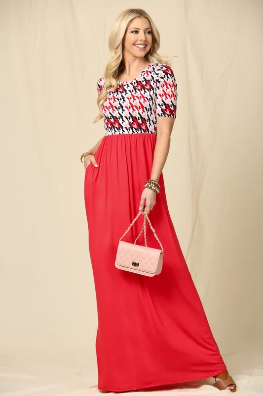 Full Size Houndstooth Round Neck Short Sleeve Maxi Dress Plus Size – Red